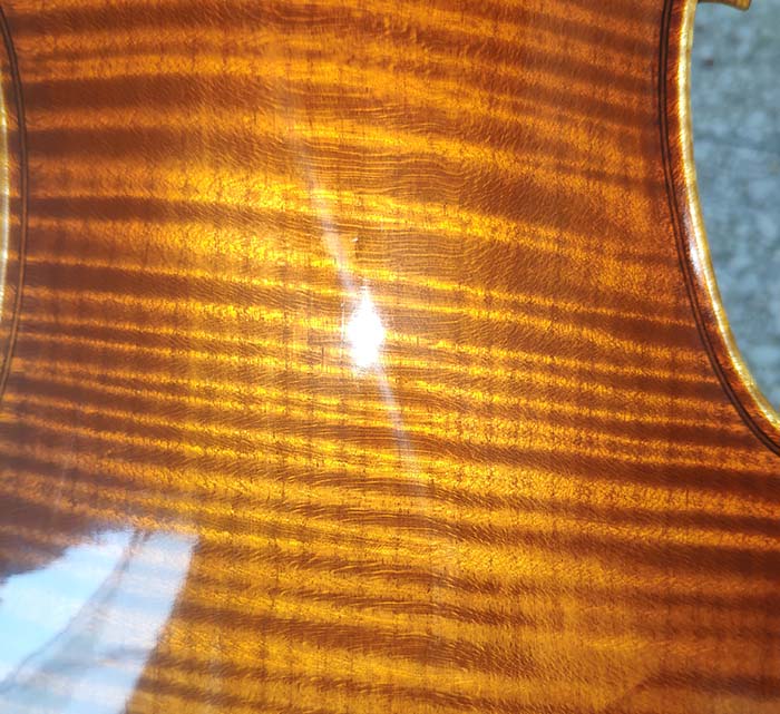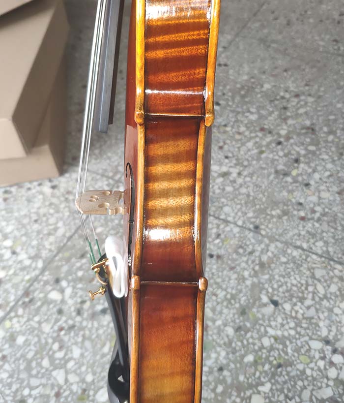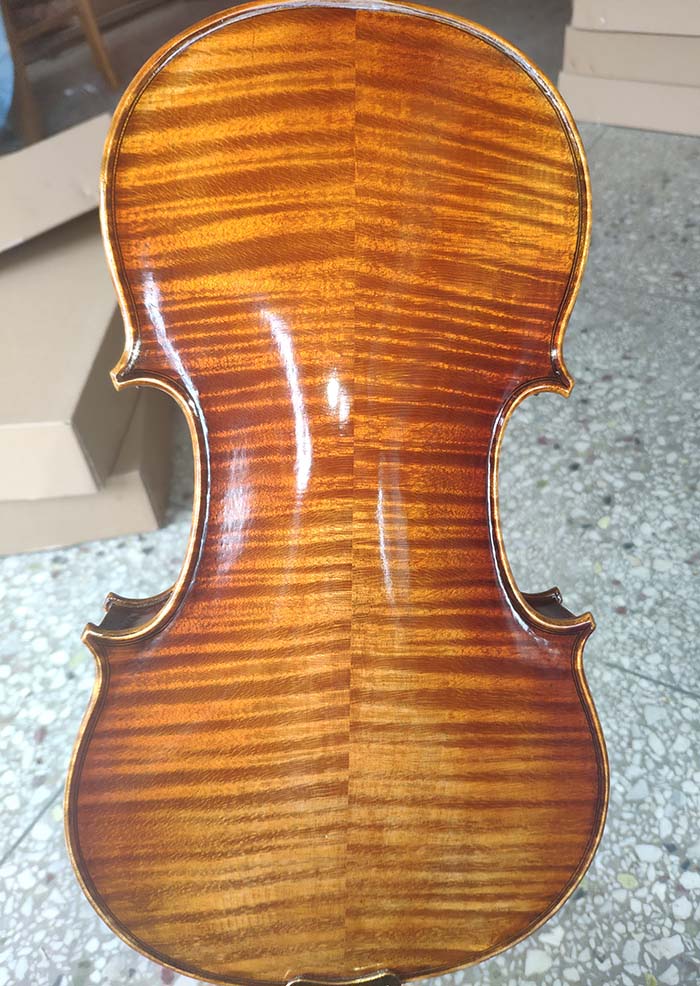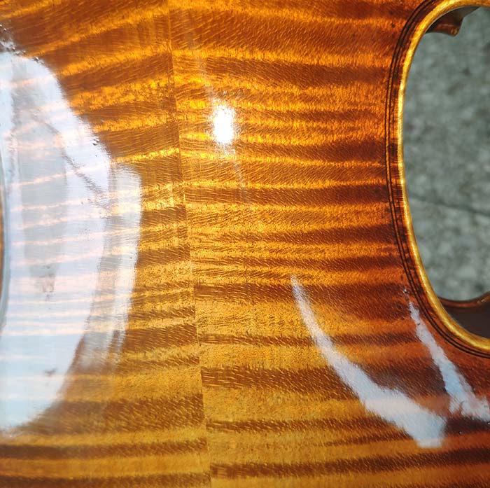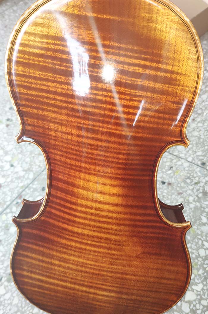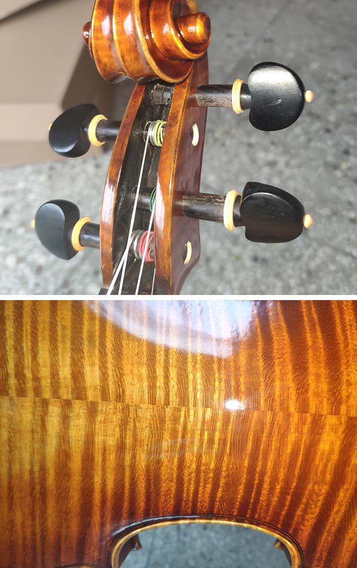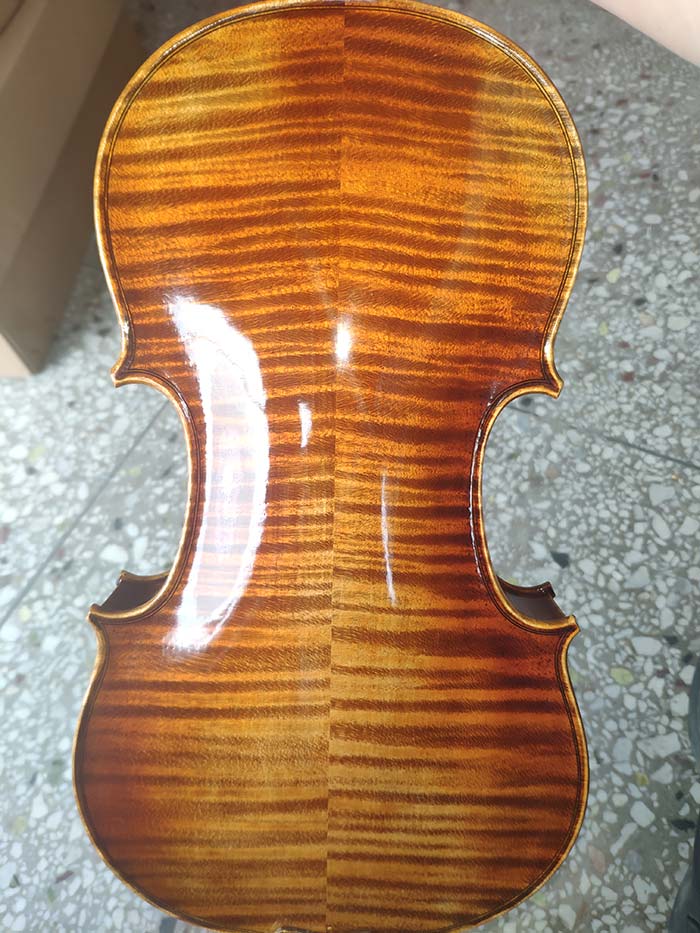 描述:背板是精選花紋均勻的美洲楓木,獨(dú)板的背板,面板年輪非常的均勻,木紋的寬度在1.2-1.5毫米。整體的油漆顏色為暗紅色,有仿舊的感覺,聲音清澈明亮,共振比較好。