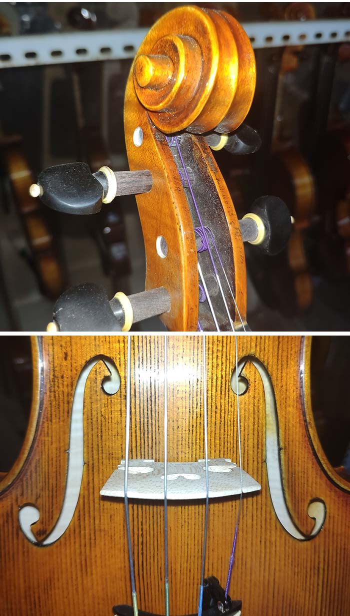 描述:該琴顏色較淺,面板的油漆是采用的仿舊工藝。透過淺色的油漆我們可以清楚的看到木材的紋路,材料上我就不多說,因為大家都可以清楚的看到。音質方面,就是一把特征明顯的歐料琴,聲音委婉而甜美,共振也相當不錯。
