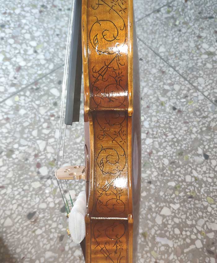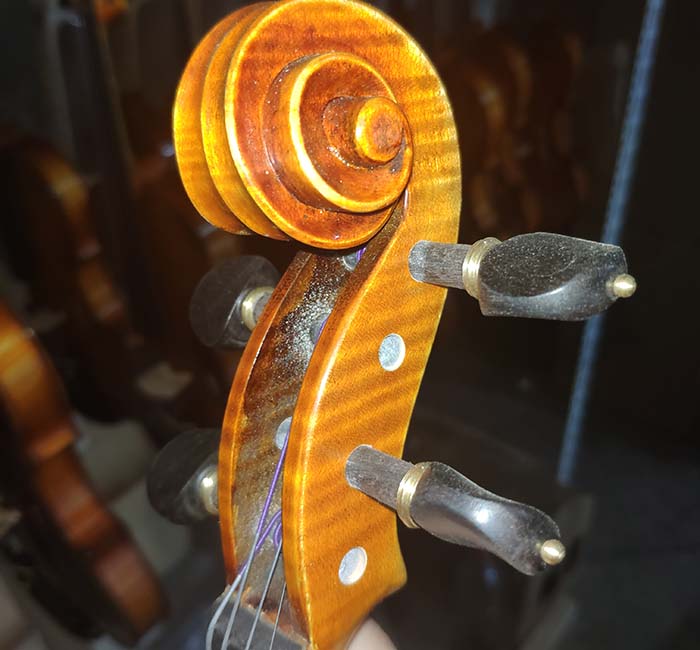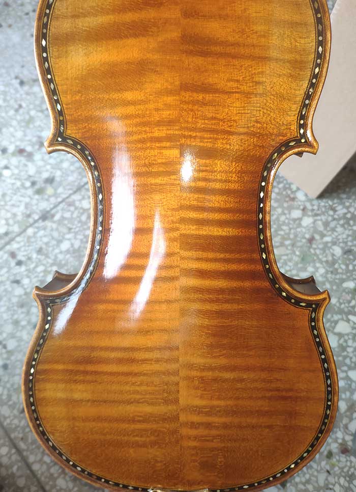 描述:一款非常精致的歐料小提琴,側板和琴頭有雕花,琴的邊緣有貝殼的鑲嵌。面板的木紋寬度在2-3毫米,背板為均勻的歐洲楓木。琴的邊緣部分油漆顏色較淺,中間部分的油漆偏深。這把琴音質非常棒,非常甜美輕盈的感覺,專業演奏者的標配。